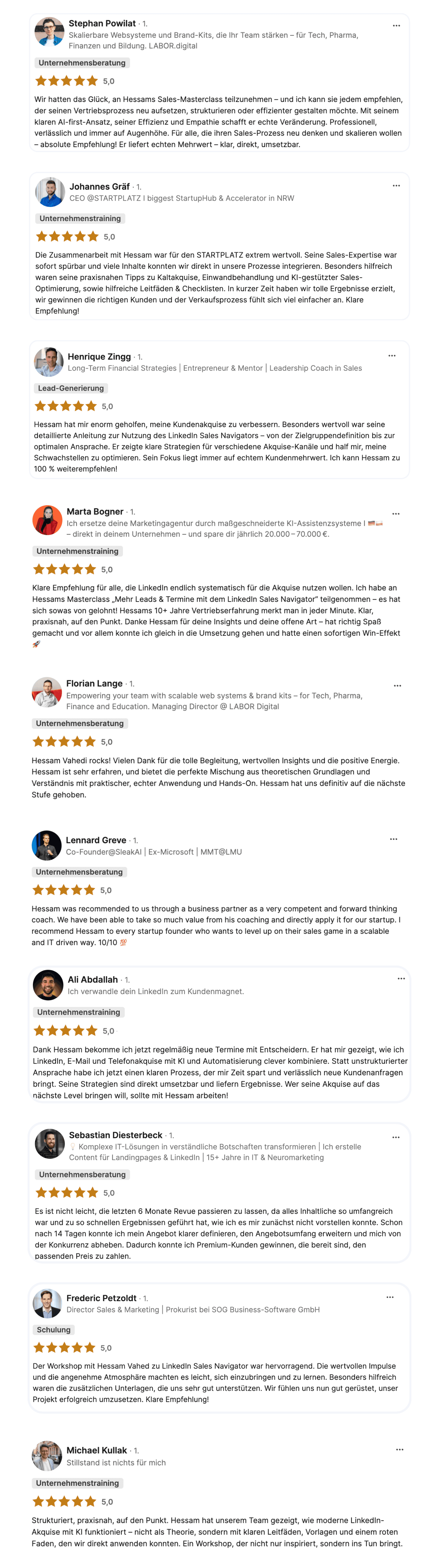 Erreiche genau diese Ergebnisse mit klaren Vertriebsprozessen, gezielten Trainings und einem KI-gestützten Akquise-System, das zu deinem Business passt.