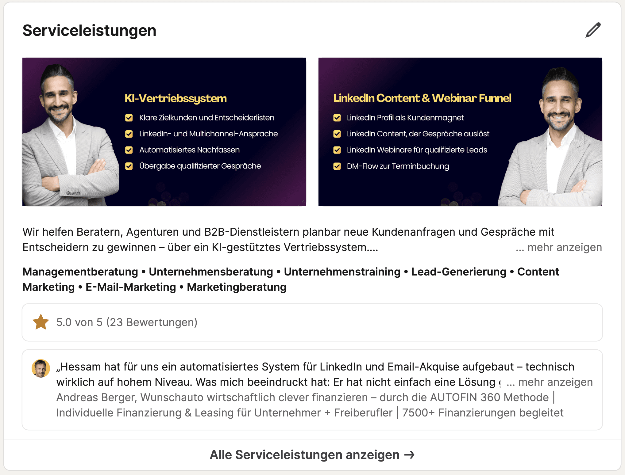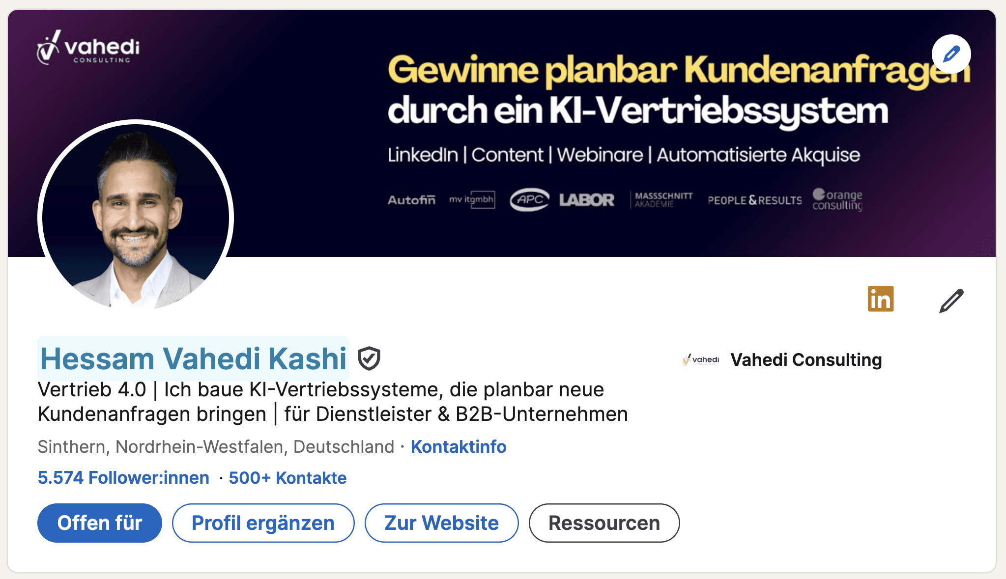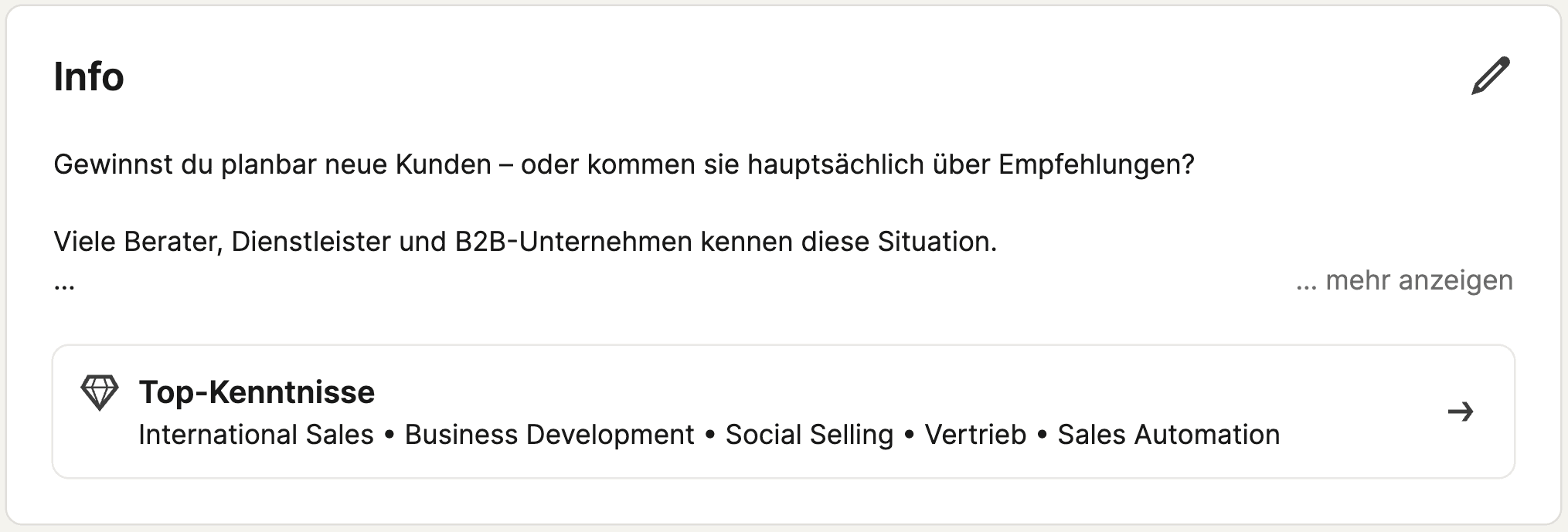 Weil LinkedIn den Nutzern jetzt stärker zeigt, wer du bist und wofür du stehst, ist dein Profil wichtiger als je zuvor. Es muss sofort klar machen: Wer bin ich? Wem helfe ich? Was bekommen sie, wenn sie mit mir sprechen? Das ist keine Visitenkarte. Das ist eine verkaufende Seite.